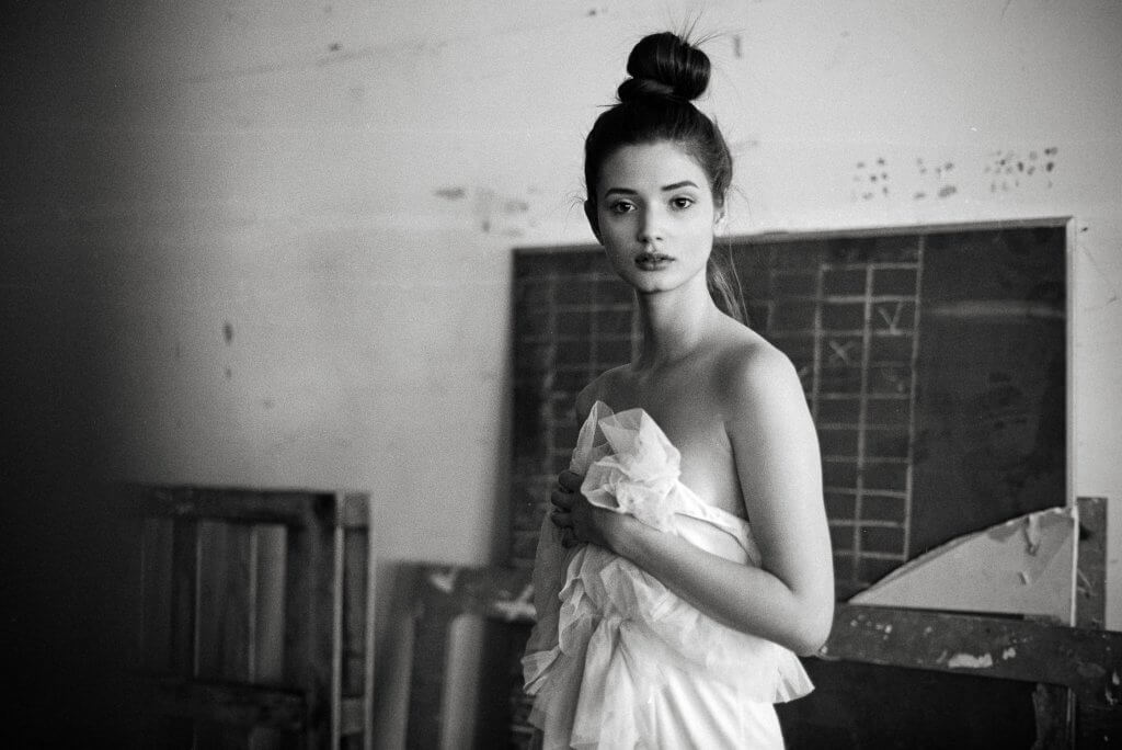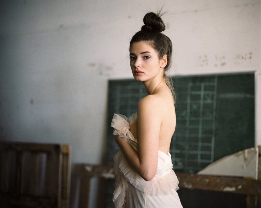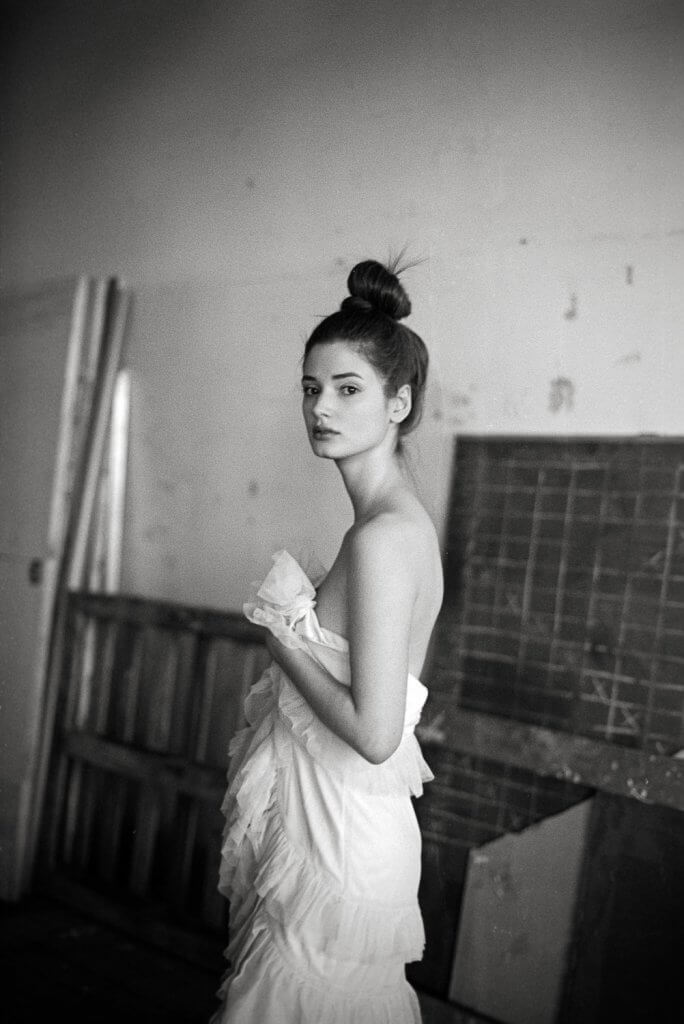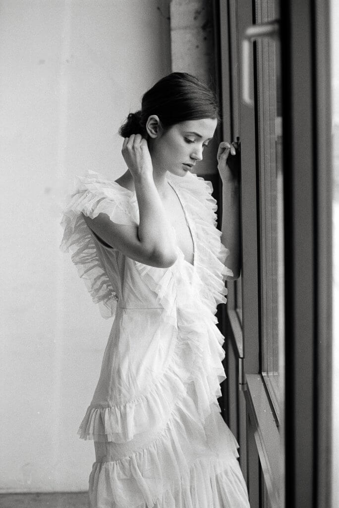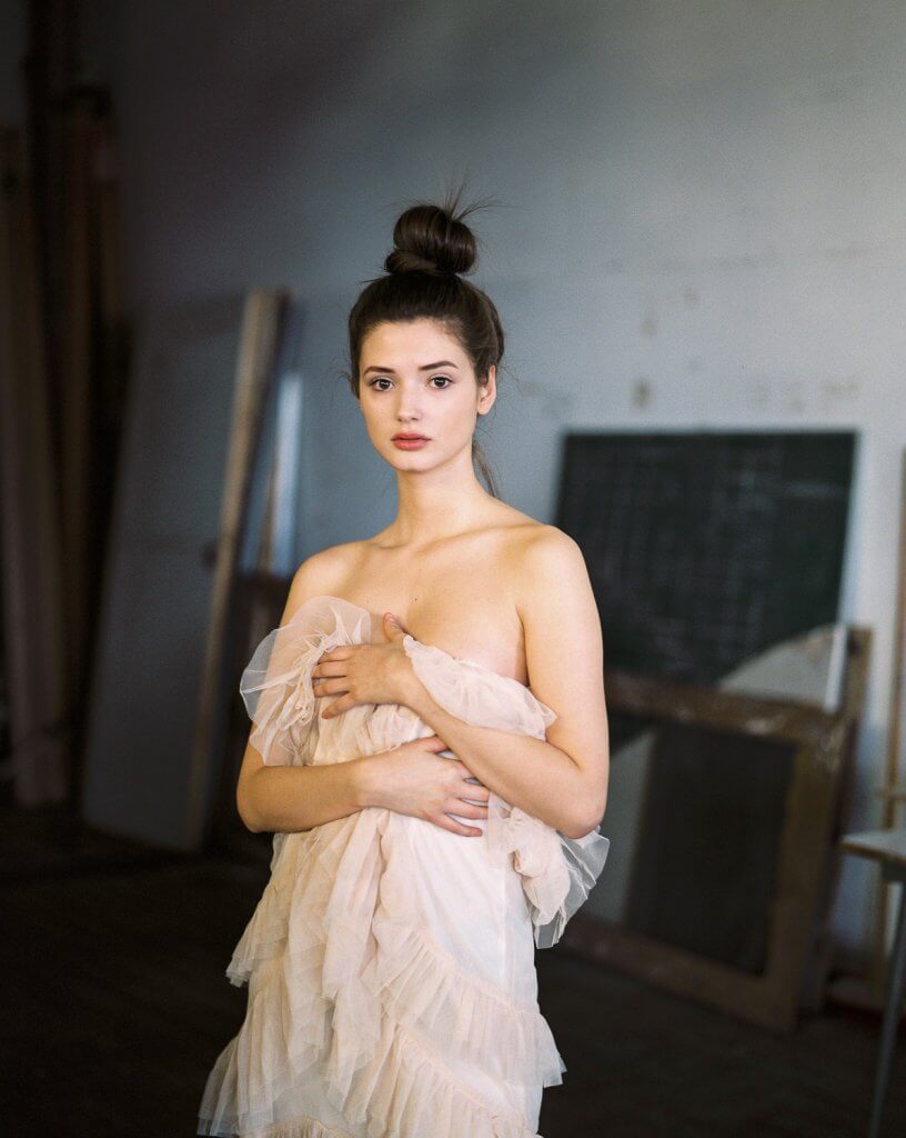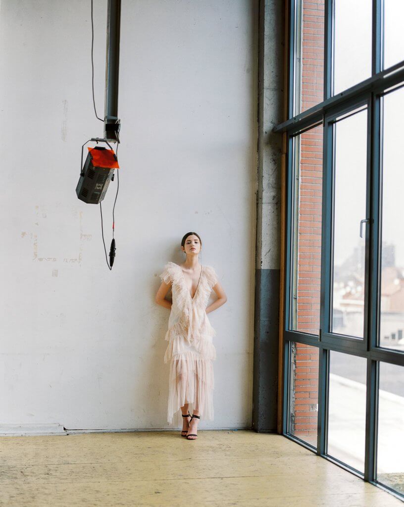 In order to make best use of the day we decided to book this artist workshop in Brussels-Molenbeek as location and to get a second model. We planned to shoot 2 hours with Manon and 2 hours with the other girl (that never showed up). When Manon walked in, she was much prettier than expected. When she put on the dress Stephanie took to the shoot, and tied her hair together I was sufficiently inspired to shoot – wow!!